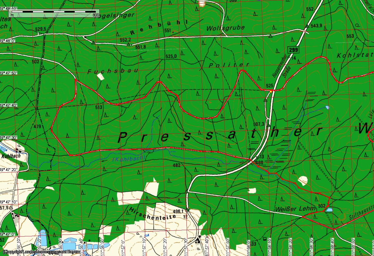 Route: Vom Parkplatz die B299 überqueren un dem Forstweg auf der anderen Seite stets folgen. An einer Kreuzung rechts bergab, dann erneut scharf rechts bergab an einem Weiher vorbei. Danach links und immer auf diesem Weg bleiben. Dieser unterquert die B299. Auch hier immer weiter geradeaus. An der Einmündung rechts abbiegen und immer geradeaus zum Parkplatz zurück.