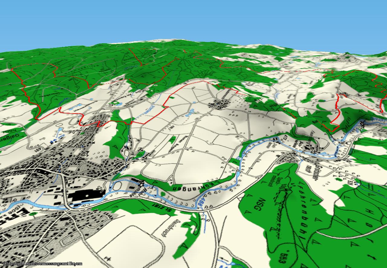 Route: Vom Parkplatz rechts hoch und über die B299 hoch ins Wohngebiet. Oben rechts und die dritte links dem Pfad durch den Wald bergab folgen und nach dem Grenzbach links auf die Teerstraße. Gleich wieder nach rechts und an der Einmündung nach links abbiegen. An der Unterstellhalle links und gleich wieder rechts abbiegen. Nun immer dem Hauptweg am Haus vorbei bis zur Teerstraße folgen. Hier rechts und gleich wieder links abbiegen. Am Waldrand entlang und am Wegende rechts und gleich wieder links. Über die Teerstraße hoch zum Festplatz auf der Schadenreuther Platte. Dort links bergab und dem Weg rechts in den Wald folgen. Hier immer auf dem verfallenen Weg bleiben, bis man am Tiefenbach wieder auf einen Fahrweg trifft. diesem nicht folgen, sondern rechts am Bach entlang. Vor der Brücke wieder rechts bergauf und beider Einmündung auf den Forstweg wieder links bergab bis man erneut den Tiefenbach kreuzt. Danach weiter rechts am Bach entlang, bis links der Wanderweg (blauer Pfeil nach links auf weissem Grund) steil bergauf führt. Immer auf diesem Weg bleiben und an einem exponierten Hochsitz vorbei die Fahrstrasse nach Bingarten querend immer auf diesem Weg bleiben, bis er die 2. Teerstraße trifft. Auf dieser rechts bergab nach Bingarten und dort rechts halten. Nach dem Dorf links zunächst auf Teer bergab. Am Wegende links am Waldrand entlang und am Waldende erneut rechts bergab bis Rosenbühl. Dort links auf die TIR 32 und bis zur nächsten Kreuzung bergauf. Hier geradeaus auf den Forstweg bergauf wechseln und diesem durch die Serpentinen folgen. Oben links auf einen verfallenen Weg wechseln und dann erneut links auf den Wanderweg abbiegen. Diesem zunächst folgen und kurz vorm Waldrand rechts auf altem Weg bergab. an der Einmündung rechts bergab halten. Am Waldrand rechts auf dem Weg bleiben und dem Wanderweg bis zum Gasthaus Waldfrieden (Hahnenehgarten) folgen. An diesem vorbei und vor der B22 links und sofort wieder rechts. Nun nach rechts die B22 unterqueren und in Guttenberg geradeaus zu den Weihern hinab. Dort links halten und an der Einmündung auf den geteerten Weg wieder rechts. Am Schiessplatz auf altem, sehr steilen Weg vorbei und oben an der Forstautobahn links. Dieser eine Zeit lang folgen und dann auf ruppigem Pfad bergab zur nächsten Forstautobahn (GPS!). Auf dieser links halten und dann erneut nach rechts auf stark verfallenem Weg hinab zur TIR 28 (GPS!). Auf dieser links und an der Einmündung der B299 links und sofort wieder rechts abbiegen. Nun links auf einem Pfad bergauf folgen. Oben scharf links auf die Forstautobahn, dann rechts dem Pfad zum Parkplatz hinauf folgen. Dort rechts halten und oben angelangt links abbiegen. Jetzt immer geradeaus (alle anderen Wege ignorieren, GPS!) bis man wieder auf einen Forstweg trifft und diesem bis zur B299 folgen. Dort links und dann rechts bergauf. Oben dann rechts bergab, dann links auf altem Weg bergab. Am Forstweg angekommen wieder rechts. Nun immer diesem Hauptweg folgen (hier könnte man links über Paterlhütte abbrechen) erneut bis zur B299. Diese queren und an Aschenhof vorbei und auf stetig schlechter werdendem Weg hinunter an den Grenzbach. Diesem auf “Trial-Brücke” überfahren und danach links halten. Nach rechts bergauf abbiegen und immer gerade bleiben bis man wieder auf eine Forstautobahn kommt. Dieser kurz nach rechts folgen und gleich wieder nach links abbiegen. dem alten Weg bis zur nächsten Forstautobahn folgen. Dabei die letzten Meter auf freier Wegewahl. Diesem Weg rechts bis nach Birkenreuth folgen. Vor dem verfallenden Haus links abbiegen und nun immer dem OWV-Wanderweg folgend bis hinunter zum Grenzbach. Dabei mehrfach der Ausschilderung folgend abbiegen. Nach der Bachbrücke links. Die nächste Einmündung dann steil rechts bergauf. Der Weg führt nun gerade zurück auf den Startpunkt.