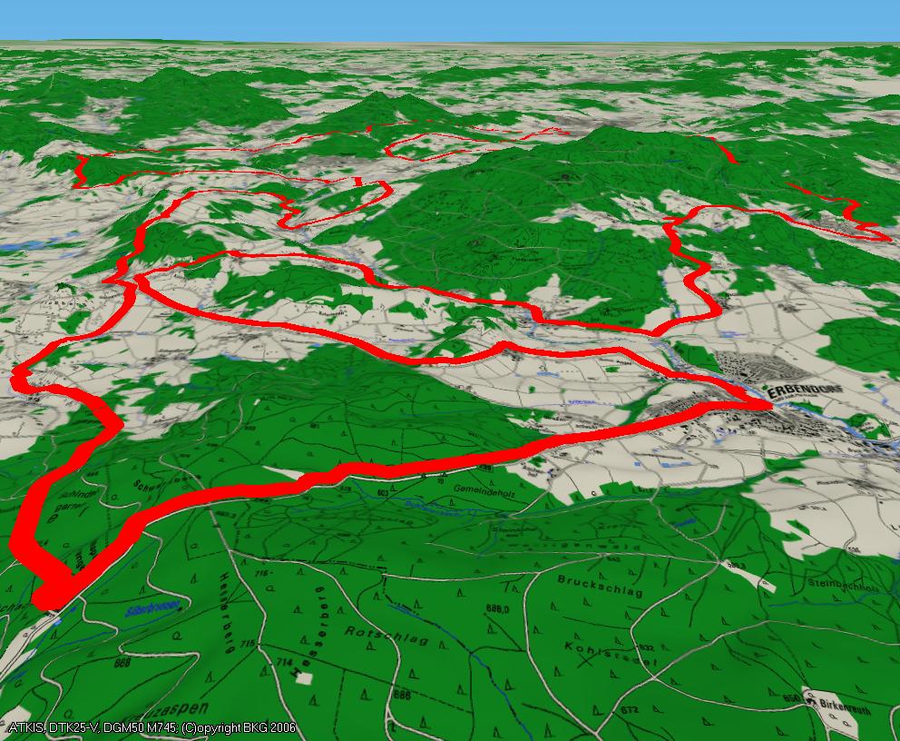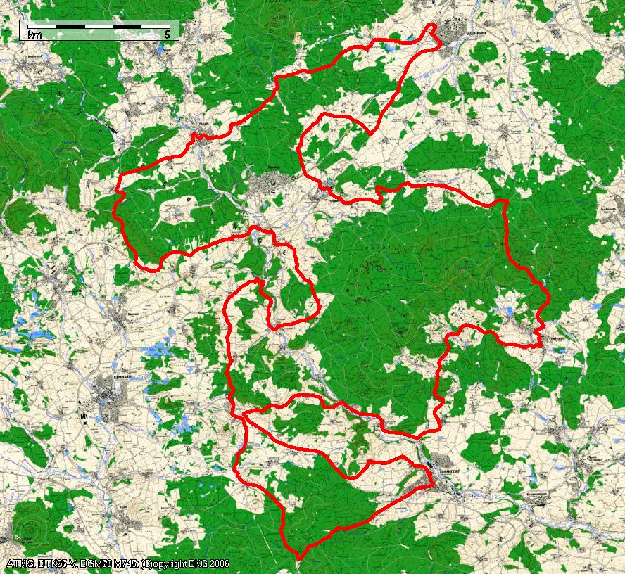 Route: Vom Erbendorf auf die B22 in Richtung Bayreuth fahren. In Höhe Waldeck rechts in Richtung Zwergau abbiegen und auf der TIR 32 bis hinunter zur Fichtelnaab. Dort rechts auf die St2181 abbiegen und dieser bis zur Abzweigung der TIR 33 kurz vor Erbendorf folgen. Links an Wetzldorf vorbai über den Wäldern nach Freidenfels. Am Stadtbad vorbei links auf die St2121 (Bergrennstrecke). Oben angekommen links abbiegen und erst 2x rechts, dann 2x links nach Pullenreuth abbiegen. Durch Pullenreuth durch und über Stockau und Leingruben zurück zur St2177. Dieser bis Waldershof folgen. In Waldershof links auf die TIR17 abbiegen. Nach der Bahnüberquerung wieder links weiter auf der TIR17 über Schurbach nun auf der TIR16 nach Schwarzenreuth.Dort rechts über die TIR13 nach Ebnath.Von dort über die TIR11 nach Frankenreuth. Dort links auf die St2665 und über die “Alm” weiter Rrichtung Kulmain. In Höhe Aign links auf die TIR21 abbiegen und dieser bis Riglasreuth folgen. Weiter über Weihermühle nach Lochau. Von dort über Haselbrunn nach Trevesen. Hier könnte man den Radweg nach Erbendorf zurückrollen. Die Tour biegt aber rechts wieder auf die St2181 ab und folgt dieser bis zu einer unscheinbaren Linksabzweigung kurz vor der Einmündung auf die St2177. Hier geht´s links hoch nach Wunschenberg und weiter über Erdenweiß, am armesberg vorbei zur Abzweigung auf die TIR8. Hier rechts bergab nach Waldeck. Dort durch den ganzen Ort immer auf der Ahuptstraße bleicben und am Friedhof geradeaus, bevor man rechts über die Lettenmühle nach Oberneumühle kommt. Hier nun links auf der TIR28 durch Atzmannsberg bis zur Einmündung auf die B299 und über den Hessenreuther Berg zurück nach Erbendorf.